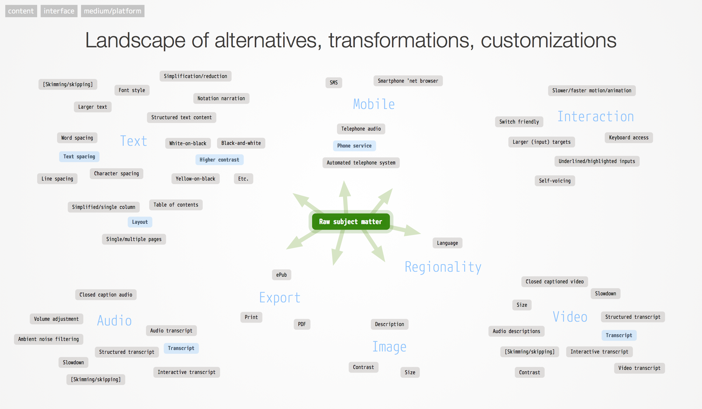 Figure 3: This diagram shows possible alternatives, transformations and customizations for different kinds of content.